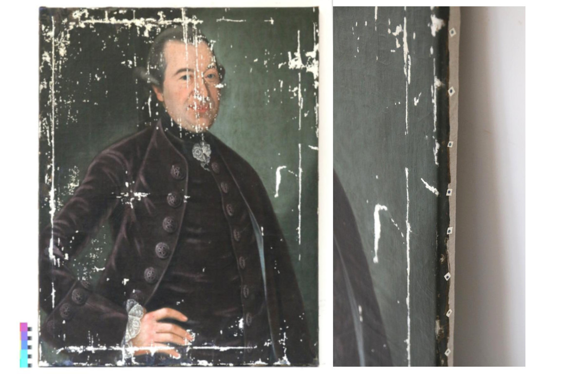 Der Zustand des über 200 Jahre alten Gemäldes war äußerst kritisch. Zahlreiche tiefe Risse und Fehlstellen, die bis in das textile Trägermaterial reichten, machten eine dringende Restaurierung erforderlich. Zudem war das Gemälde auf einem verzogenen Spannrahmen aufgezogen, wodurch auffällige Falten und Deformationen entstanden. An vielen Stellen hob sich die Malschicht ab, und zahlreiche kleine Farbschollen hatten sich bereits gelöst. Die malerischen Qualität und ihr Detailreichtum war durch den stark verbräunten Firnis kaum noch erkennbar. Durchgeführte Maßnahmen: Oberflächenreinigung, Malschichtfestigung, Planierung, Firnisabnahme, Schließen von Rissen und Fehlstellen im textilen Träger, Doublierung, Aufziehen auf neuen Keilrahmen, Kittung, Retusche, Firnisauftrag.