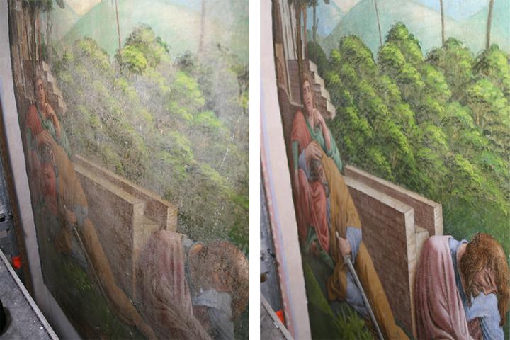 Restaurierung eines Wandgemäldes aus dem 19. Jahrhundert mit stark verbräuntem Überzug. Durchgeführte Maßnahmen: Reinigung, Entschichtung mittels Wolbers-Gel, Malschichtfestigung, Kittung, Retusche, Firnis und Dokumentation.